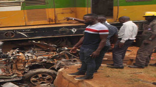 Police officers and railway line officials at the accident scene in Kireka, Wakiso District, yesterday. PHOTOs/Stephen Otage