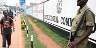 A Police constable keeps guard at the Electoral Commission offices in Kampala. Security at the commission headquarters have been beefed up following an impending demonstration by the opposition parties who want the current leadership of the commission disbanded. Photo by Stephen Wandera