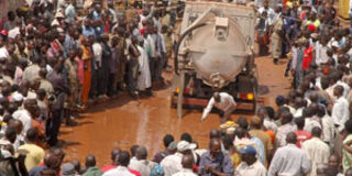 Traders operating along Kafumbe Mukasa Road in downtown Kampala watch a truck suck water from the road on Wednesday. The traders staged a peaceful demonstration demanding Kampala City Council to fix the dilapidated road. Photo by Stephen Wandera